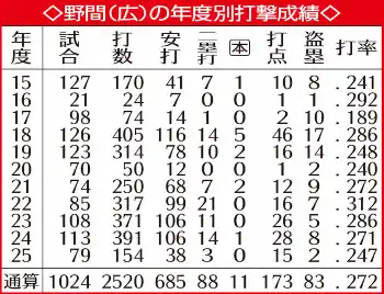 24年は開幕から出場14試合で7二塁打と量産した。この時期の打撃の感覚も参考にしながら修正に努めている。昨季は出場79試合で打率・247、0本塁打、15打点。先発出場は25試合にとどまった。代打では打率・255、得点圏打率・333と一定の成績を収めたとはいえ、目指すのは外野の定位置奪取だ。
