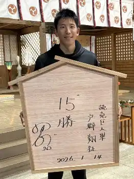 練習後には、延岡市内の今山八幡宮で137段の階段トレーニングを行い、参拝後には縦横約1メートルの巨大絵馬に「15勝」と力強く書き込んだ。同神社は商売繁盛などに御利益があるとされる。リーグ優勝&日本一へ、白星の“稼ぎ頭”となる。(田中 健人)
