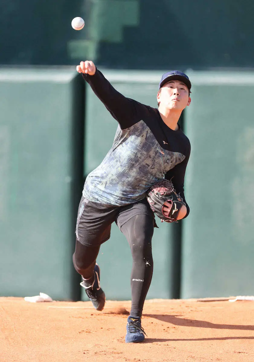 片膝を突いた捕手に約20球を投げ「違和感はないけど、まだ傾斜になじんでいない。傾斜と友達になれるように」と話した。