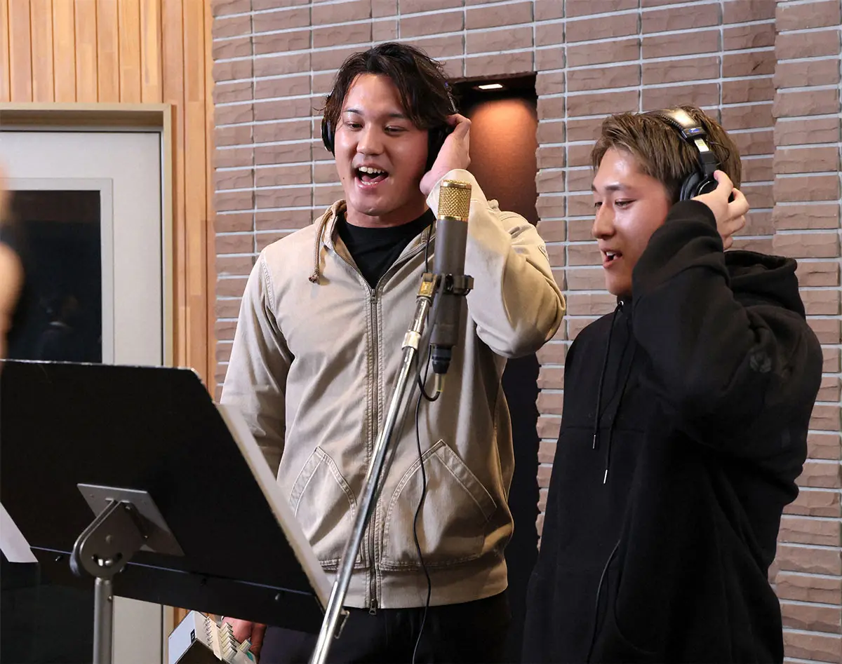 「熱き星たちよ」のレコーディングを行う藤浪(左)と松尾