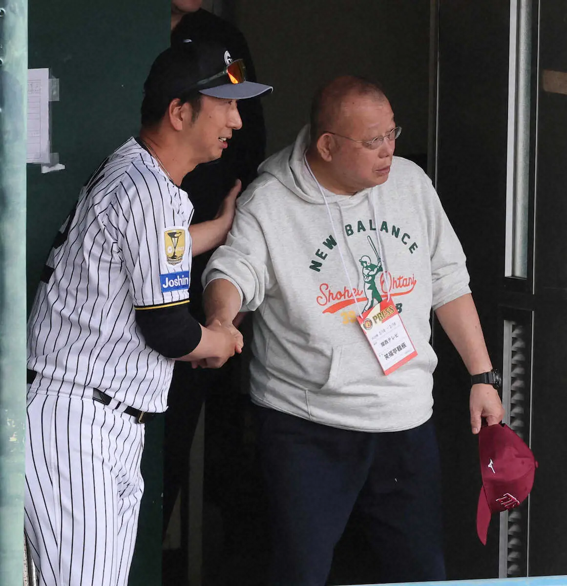 握手をかわす藤川監督(左)と笑福亭鶴瓶(撮影・大森 寛明)