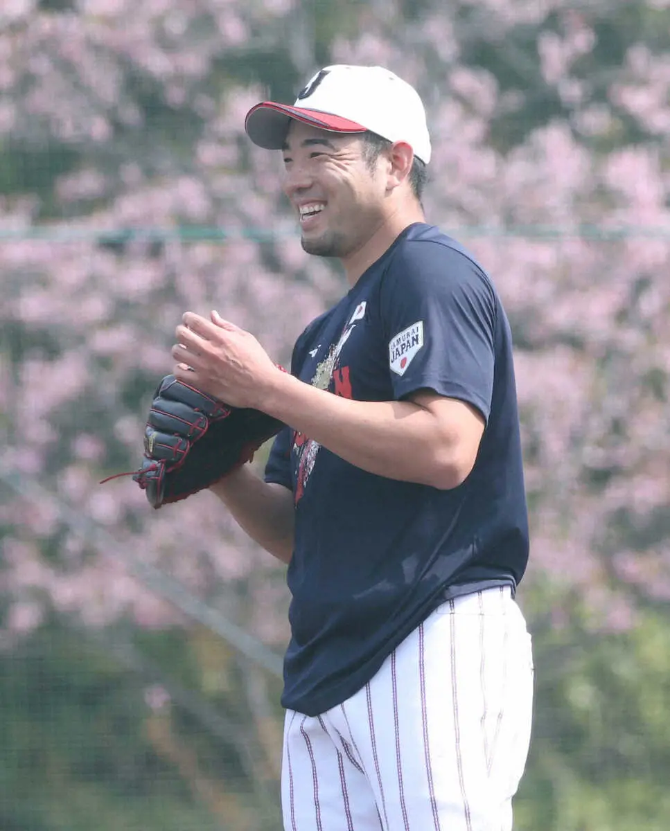 球場では侍ジャパンのユニホームを着て写真撮影。その後にスパイクに履き替え、サブグラウンドで約40球のキャッチボール。投本間の距離で、「うっ!」と声を出しながら変化球も含めて力のあるボールを投げ込んだ。