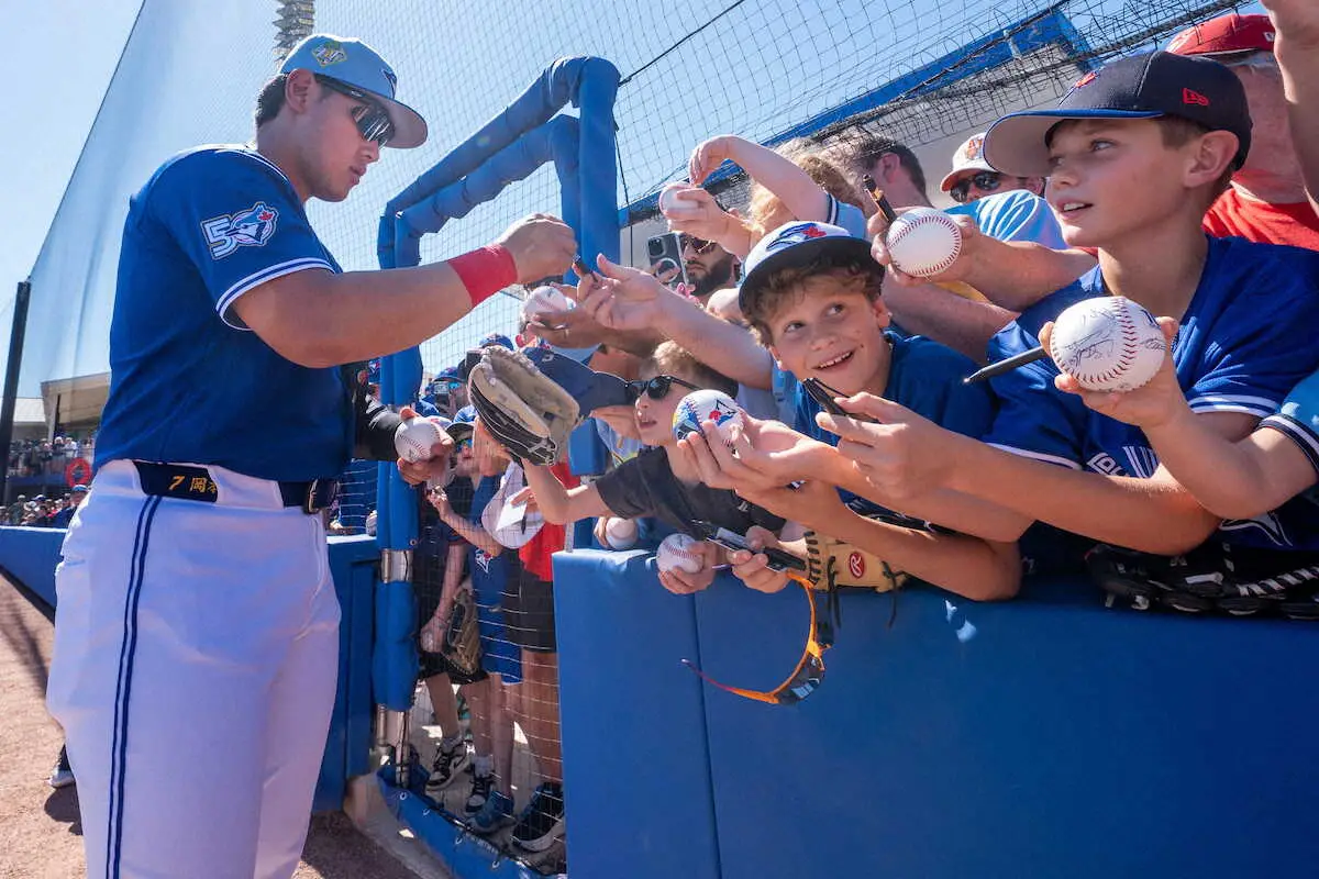 4回の第2打席。2死走者なしで打席に立った岡本は、相手3番手右腕・レーザーが投じた2球目をコンパクトに振り抜いたが、結果は三塁手正面のゴロだった。この回を終え、ブルージェイズベンチは多くの選手を交代。岡本も交代となりオープン戦初戦は無安打に終わった。試合後には、多くの子供たちからサインを求められる場面も。声掛けに笑顔で応え“プチサイン会”となった。