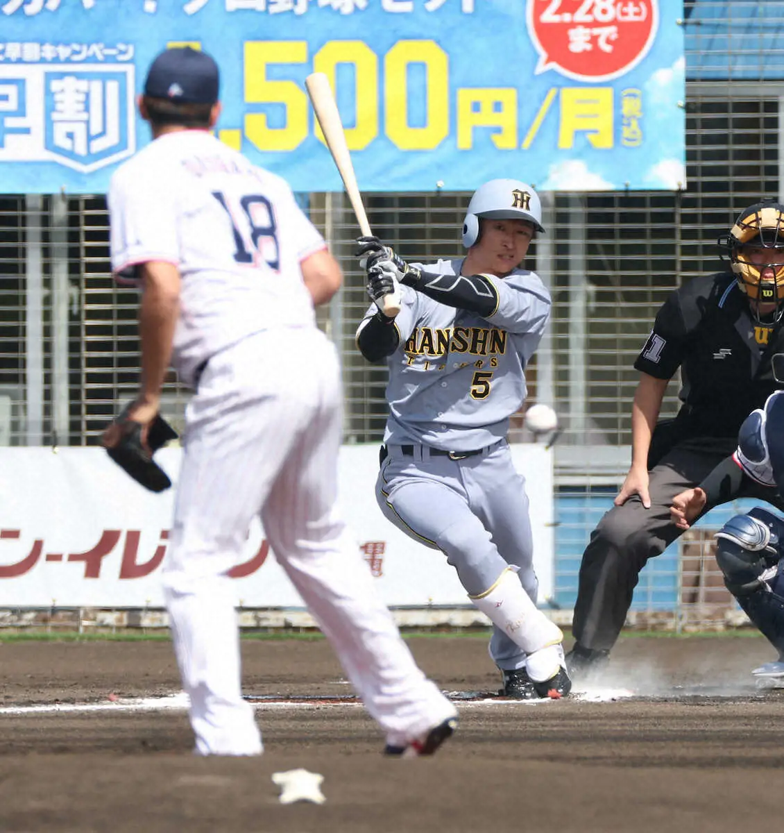 「1番中堅」スタメンの近本は初回、奥川の初球をとらえた遊撃内野安打で出塁。3回1死二塁は見逃し三振に倒れたが、5回先頭では2番手の左腕・増居を強襲する二塁内野安打を放った。