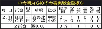 阪神・今朝丸の今春実戦登板 Photo by スポニチ 阪神 高卒2年目・今朝丸裕喜 レイエスK斬り!1回1/3パーフェクトの花丸O… ギャラリーで見る この記事のフォト 2026年02月24日の画像一覧 もっと見る 2026年02月24日の画像をもっと見る
