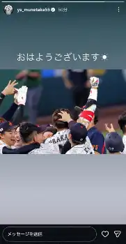 ホワイトソックスの村上宗隆内野手(26)が1日、自身のインスタグラムを更新。ストーリーズに23年ワールド・ベースボール・クラシック(WBC)準決勝・メキシコ戦のワンシーンを投稿。サヨナラ打を放った自身が、歓喜の輪の中で右腕を突き上げる写真に「おはようございます」とあいさつを添えた。