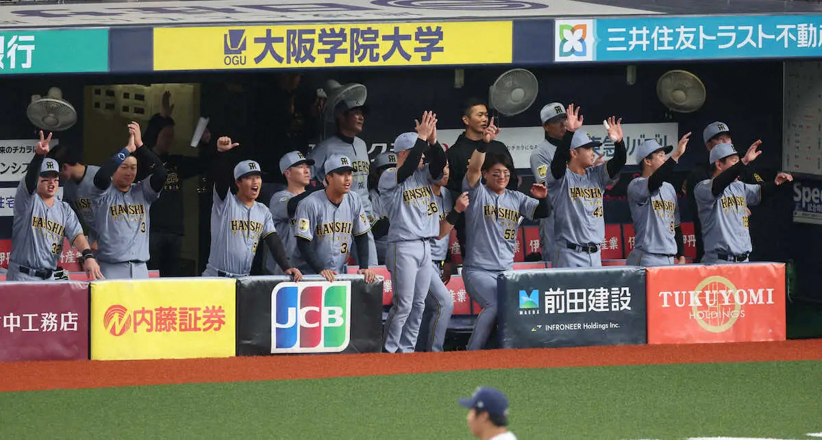WBC強化試合<阪神・韓国代表> 2回、伏見が勝ち越しの適時二塁打を放ち、歓喜する阪神ナイン (撮影・平嶋 理子)