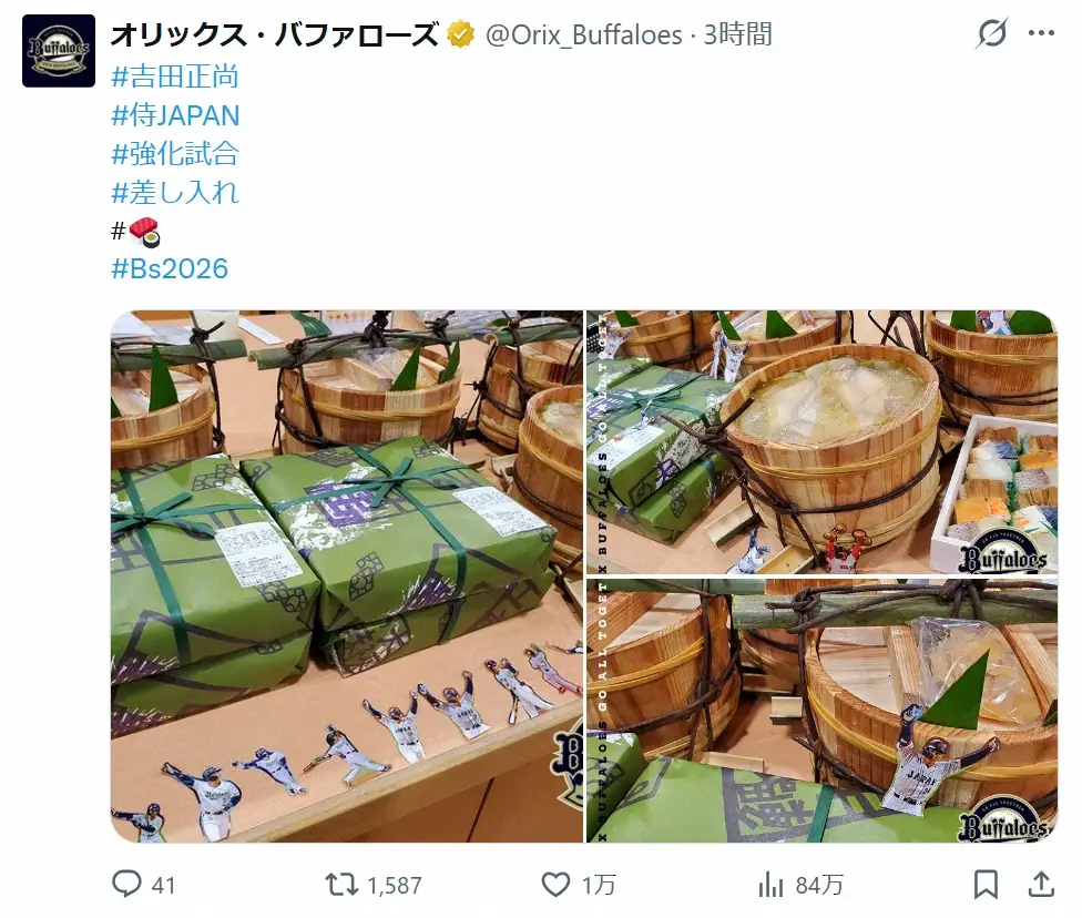 ハッシュタグで「#吉田正尚 #侍JAPAN #強化試合 #差し入れ #Bs2026」と侍ジャパン選出のOB、吉田正尚からの差し入れであることが明かされた。