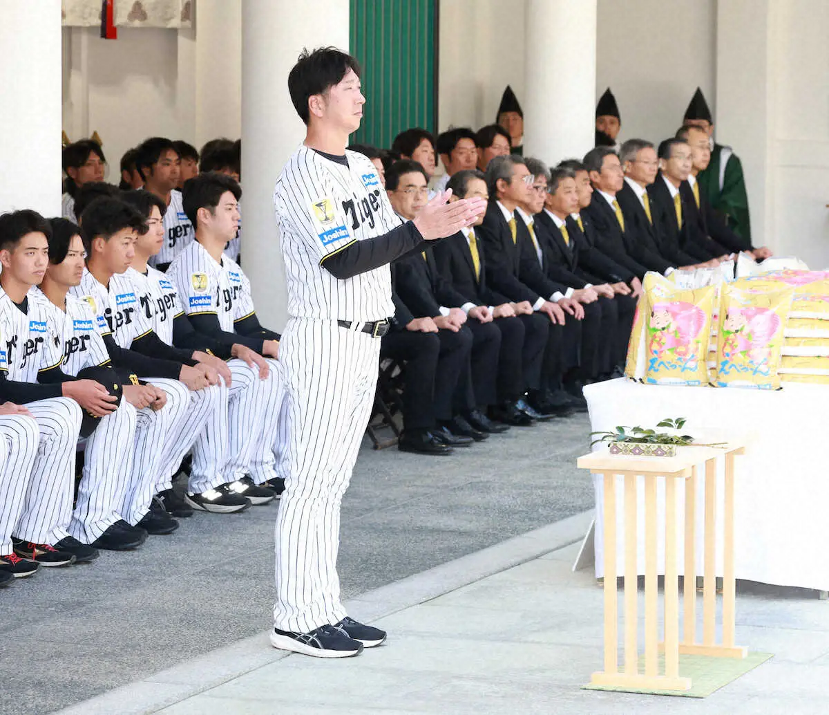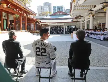 甲子園球場での全体練習前には阪神・藤川監督以下、球団フロント、選手ら約150人が毎年恒例の西宮神社を訪れた。選手、コーチらは「六甲おろし」が流れる中、約500人のファンが待つ参道を通って本殿へ入り、日本一とシーズンの無事を祈願。「ケガなくシーズンを回れるように。1年間頑張りたいという気持ちになった」