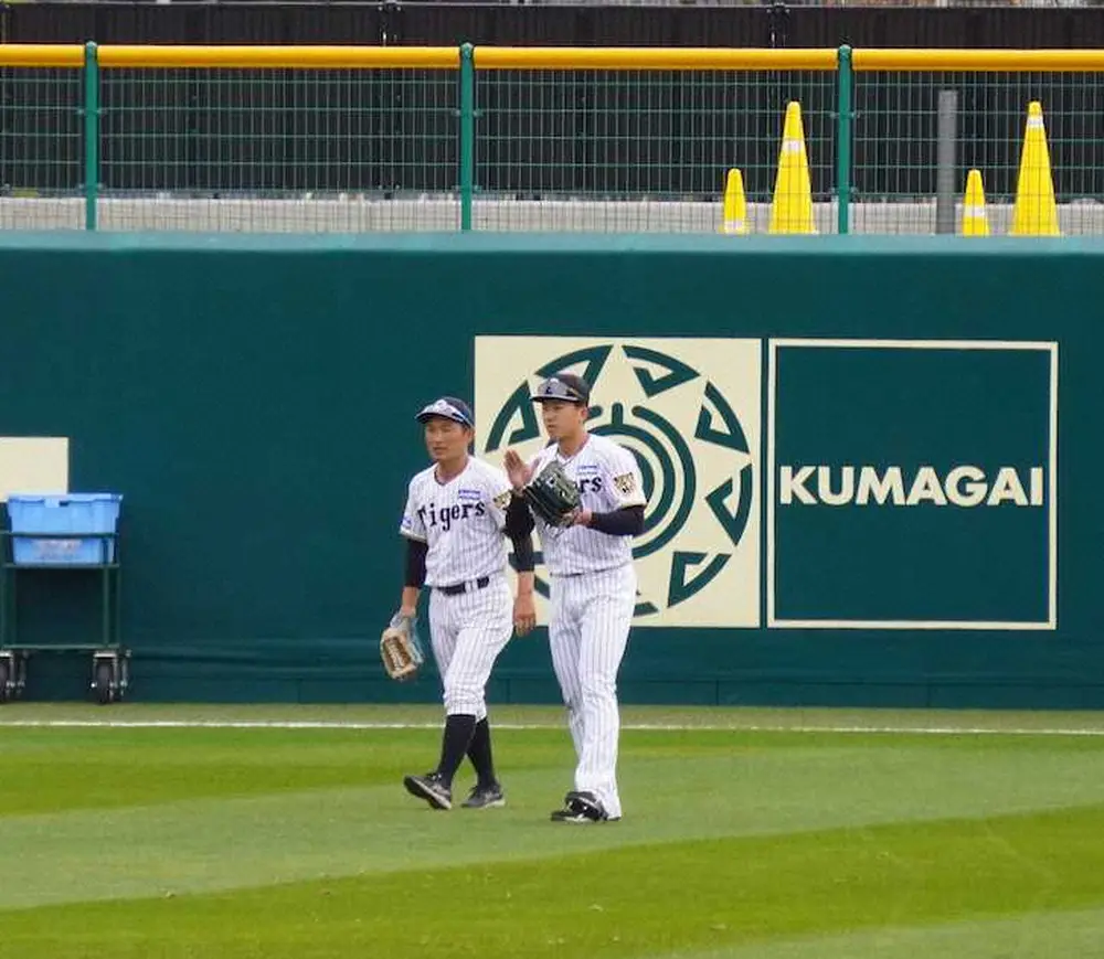 工藤ファーム外野守備走塁コーチと左翼で打球を捕球する阪神・立石(撮影・長谷川 柚香)