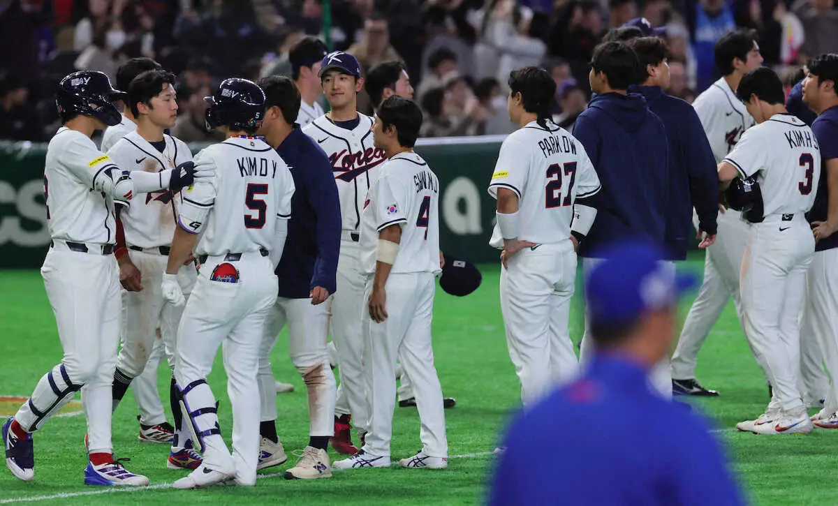 <韓国×台湾>延長10回で敗れた韓国ナインはスタンドへお辞儀する(AP) Photo by AP 【WBC】韓国は打線振るわず連敗 指揮官は台湾先発・古林睿煬の好投を称賛… ギャラリーで見る この記事のフォト 2026年03月08日の画像一覧 もっと見る 2026年03月08日の画像をもっと見る