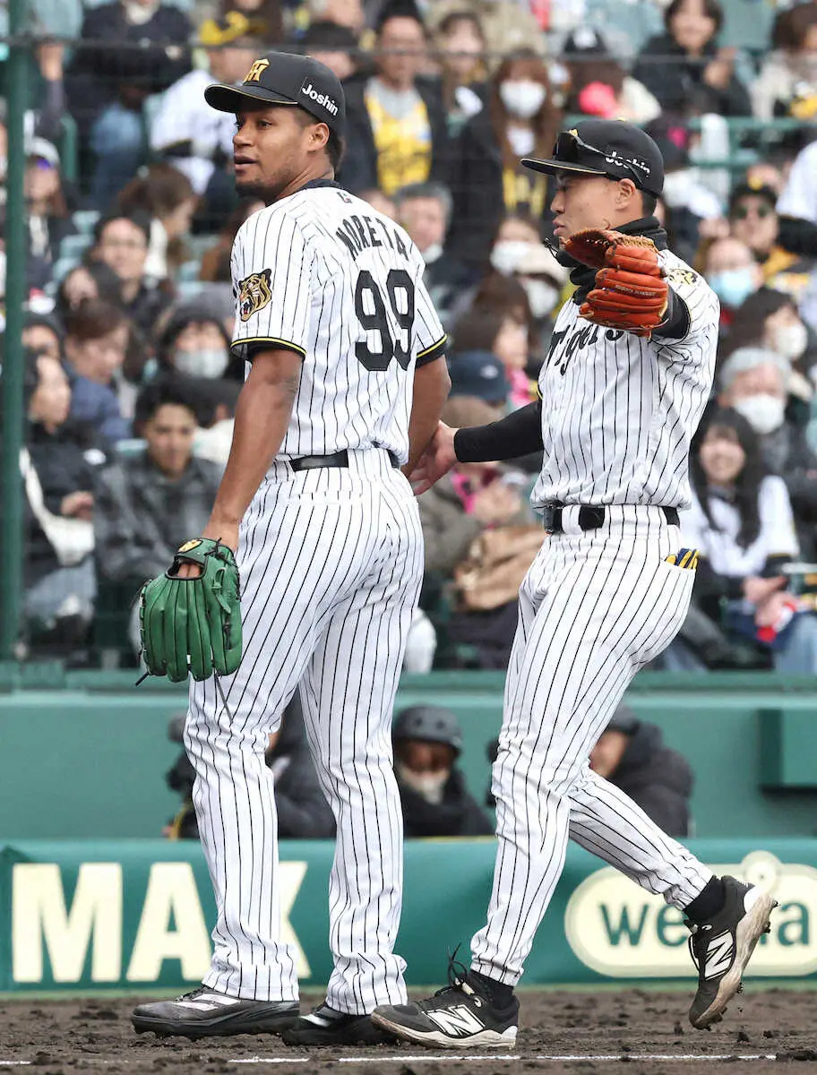 阪神新外国人投手ダウリ・モレッタが8回表を無失点で切り抜け、間違えて三塁側ベンチに歩んだ。一塁側ベンチの監督・藤川球児が前に出て「こっち、こっち」と手招きした。三塁手の佐野大陽にうながされて気づき、苦笑いしていた。