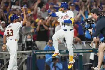 22年からMLBで3年連続の首位打者を獲得した主軸の先制打で、打線は一気に活気付く。1死三塁からロイヤルズ一筋で通算1712安打、303本塁打を記録。WBCには4大会連続で出場する4番、サルバドール・ペレスが左前打で追加点をたたき出す。さらにメジャー通算325本塁打の5番、ユジニオ・スアレスが左翼席に2ランを放ち、この回計4得点。序盤の大量得点で完全に勢いに乗った。