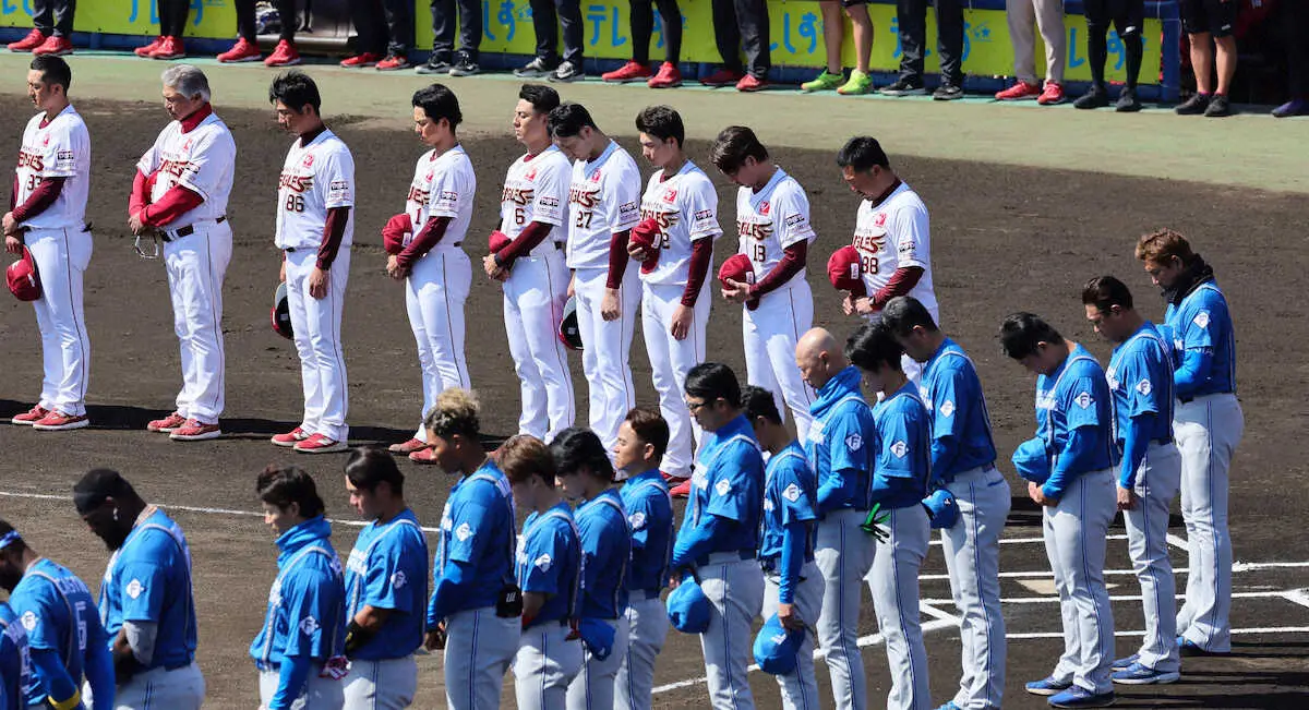 この日デーゲームで行われたのは楽天―日本ハム(静岡)、ロッテ―オリックス(ZOZOマリン)、DeNA―広島(横浜)、阪神―西武(甲子園)の4試合。球場は半旗とされ、監督、選手、スタッフがベンチ前に整列して祈りを捧げた。