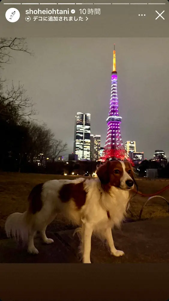 ドジャースの大谷翔平投手(31)が11日までに自身のインスタグラムのストーリーズを更新。愛犬・デコピンが東京タワー付近を散歩する愛くるしい写真を投稿した。