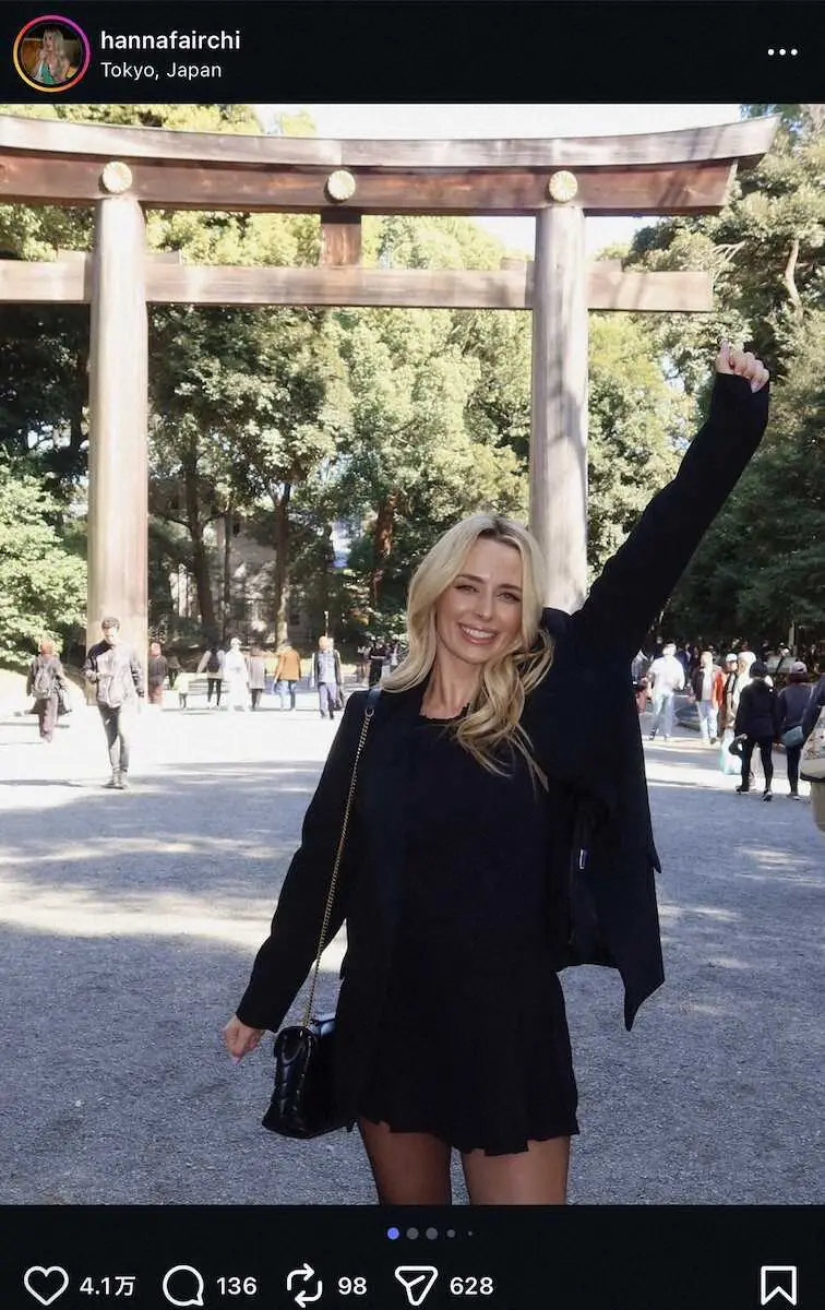 フェアチャイルドの妻・ハンナさんは東京ラウンドが終わっても日本に滞在。「tokyo drifting」と夫との東京観光ショットを公開した。