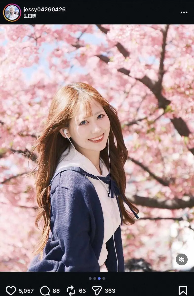 ジェシーは自身のインスタグラムで「生田駅で早咲きの桜に出会った。3月の日本は、まるで物語みたいに美しい」と早咲きの桜を背景にした制服姿を投稿した。