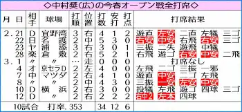 広島・中村奨成外野手(26)が打ってつないで、4年ぶりの開幕1軍へ大きく前進した。12日のDeNA戦(横浜)に「2番・右翼」で先発。オープン戦1号となる左越え2ランを含む2安打2打点と躍動すると、5回には8球粘って四球を選びチャンスを広げた。3月27日の開幕・中日戦(マツダ)は2番での先発が濃厚。新井貴浩監督(49)は「可能性はある」と明言した。