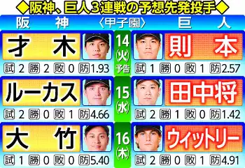 好相性の聖地で宿敵を迎え撃つ。甲子園での同戦は23年9月14日から6連勝中。プロ初勝利の相手も巨人で、通算では12試合8勝2敗、防御率1・51を誇る。新助っ人や好調の中軸を警戒しながらも、自らのスタイルを変えるつもりはない。「いつも通りに行きます」と冷静に見据えた。