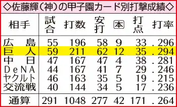 過去、甲子園での巨人戦は、同球場での同一リーグのカード別2位となる打率・294(211打数62安打)、同2位の35打点と好相性。中でも本塁打は同最多12本を放っている。ここで本塁打も量産態勢に入ることができれば、4月中にも打撃主要部門3冠を独走することにつながる。