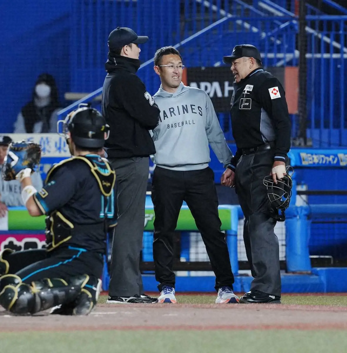 深谷篤球審が、ロッテ―日本ハム戦の初回にケガで交代した。ロッテ・寺地が二ゴロを打った際に折れたバットが後ろに飛び、右腕に当たった。代わって、一塁塁審の牧田匡平審判員が球審を務めた。
