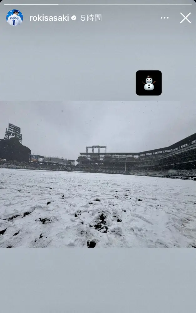 <ロッキーズ・ドジャース>大雪で銀世界となったフィールドを撮影する佐々木(撮影・沢田 明徳) Photo by スポニチ 佐々木朗希が極寒の中ブルペン入り 日本時間4・20“打者天国”で初勝利なる… ギャラリーで見る この記事のフォト 2026年04月18日の画像一覧 もっと見る 2026年04月18日の画像をもっと見る