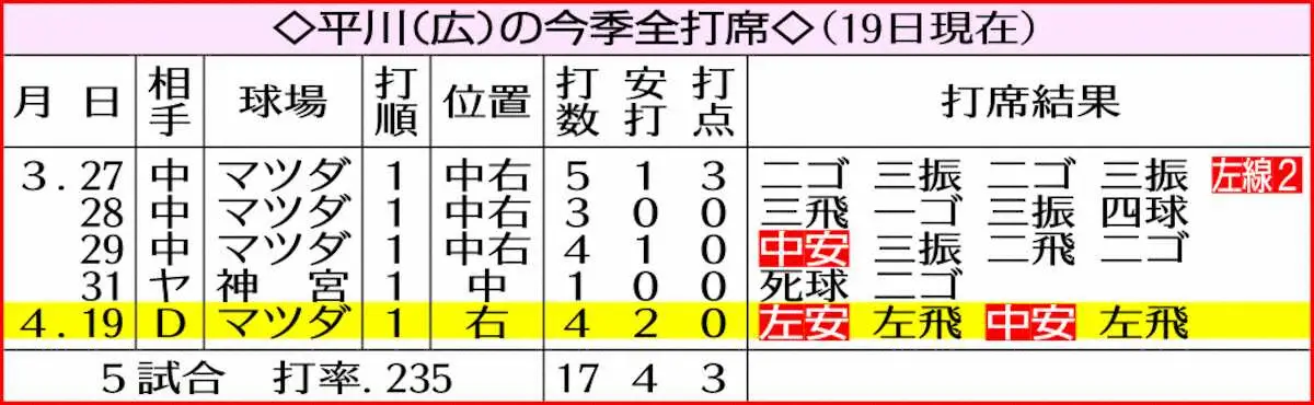 <広・D(5)>初回、安打を放つ平川(撮影・椎名 航) Photo by スポニチ 広島ドラ1・平川蓮 盛り塩で右肩清めてフルスイング「かけたらケガしない… ギャラリーで見る この記事のフォト 2026年04月20日の画像一覧 もっと見る 2026年04月20日の画像をもっと見る