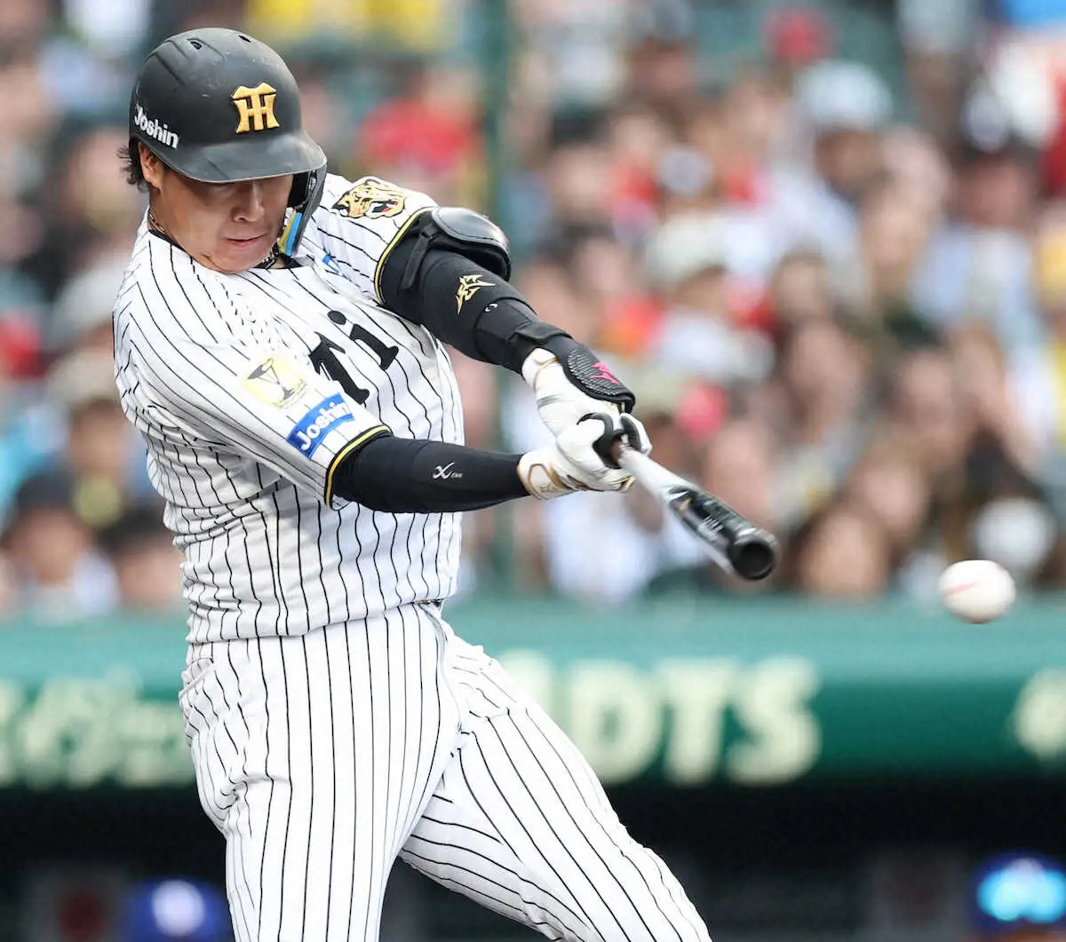 阪神・大山が今季、自身初の複数打点で貢献した。佐藤輝の左犠飛で1点差とした5回、なお2死一、二塁の同点機で左前にはじき返す同点打だ。