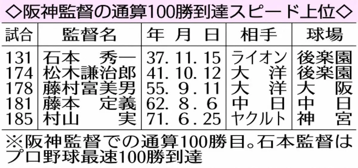 2リーグ制以降の監督通算100勝到達スピード上位 Photo by スポニチ 阪神・才木浩人 感謝の1勝必ず!藤川監督セ最速100勝あと「1」で21日先発… ギャラリーで見る この記事のフォト 2026年04月21日の画像一覧 もっと見る 2026年04月21日の画像をもっと見る