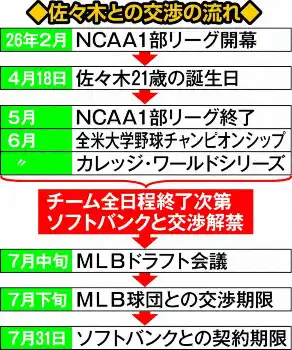 佐々木は19日(日本時間20日)のマイアミ大戦で2試合連続となる12号を放つなど調子を上げている。7月中旬に予定されているMLBドラフト会議でも指名される可能性があり、「打てば打つほど(ソフトバンク入団は)遠くなる。不思議ではありますけどね」ともどかしい思いも口にした。ほかに「大学残留」「他大学への編入」という選択肢もある。
