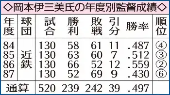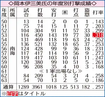 岡本 伊三美(おかもと・いさみ)1931年(昭6)2月26日生まれ、京都市出身。洛陽高(京都)からテスト生として南海(現ソフトバンク)入りし、50年にデビュー。好打の二塁手として52年に初のベストナイン。53年は首位打者を獲得しリーグMVPに輝いた。63年の引退後は南海、サンケイ、阪神、近鉄でコーチを歴任。84~87年は近鉄を指揮し、退任後は球団代表も務めた。次女はテニスで活躍した岡本久美子さん。