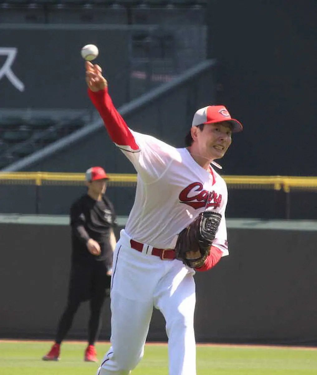 マツダスタジアムでの投手指名練習。大瀬良は日の光を浴びてグラウンドで汗を流し、室内のブルペンに移動して36球を投げた。本拠地での、あす22日のヤクルト戦に先発予定。今季初の1軍登板に向け、静かに闘志を燃やした。