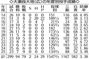 投打がかみ合い、首位を快走するヤクルトには通算17勝9敗、防御率3・52と好相性。マツダスタジアムでは9勝2敗、同2・20を誇る。14年以来299試合の登板を重ね、今回が節目の通算300試合登板。同100勝も残り6勝に迫り、ぜひ白星をつかみたい。