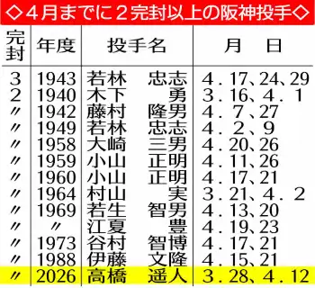 球団投手で4月までに3度の完封勝利を挙げたのは、1リーグ時代の1943年若林忠志のみ。83年ぶり、球団左腕では史上初の快挙へ――。本人に全くその気はなくても、完全体の遥人なら期待は膨らむ。(山手 あかり)