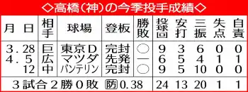 ○…高橋(神)の今季2勝は、いずれも完封。球団で4月までに3度の完封勝利を挙げると、1リーグ時代の1943年に若林忠志が達成して以来になる。同年はシーズン84試合のうち、若林は52試合に登板。39完投、10完封で24勝15敗、防御率1.06だった。