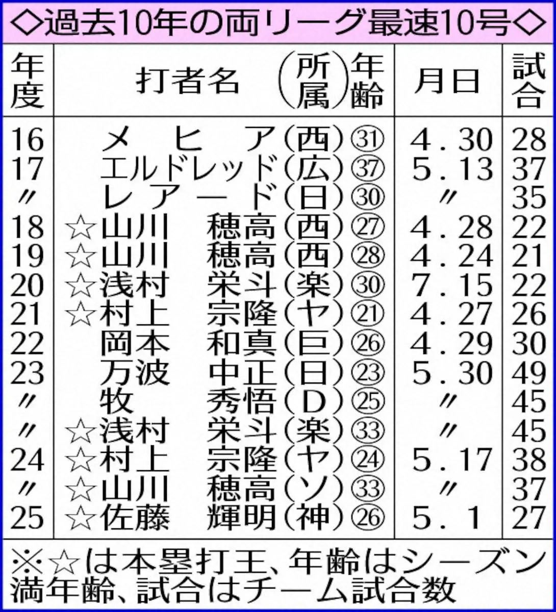 万波と同学年の森下(神)にもチャンスは十分ありそう。ここまでセ・トップの7本塁打。阪神勢は昨年も佐藤輝が両リーグ最速10号をマークしており、2年連続で同一チームの異なる打者が達成すれば67、68年の王貞治→長嶋茂雄(巨)以来58年ぶりとなる。また、26歳シーズンでの達成は72年田淵幸一、前記佐藤輝に並ぶ球団最年少記録だ。