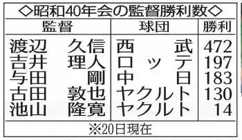 ≪昭和40年会の監督では渡辺久信氏がトップ472勝≫昭和40年会で監督を務めたのは、池山監督で5人目。勝利数のトップは元西武監督の渡辺久信氏で472勝。昨年までロッテを指揮した吉井理人氏は197勝を挙げた。監督経験のある与田剛氏、古田敦也氏に加え、40年会には山本昌氏、水野雄仁氏、星野伸之氏、八木裕氏らがいる。