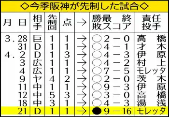 ○…阪神は初回、森下の併殺打の間に1点を先制も9―16の逆転負け。開幕から継続していた、先制した試合の勝利は9でストップした。