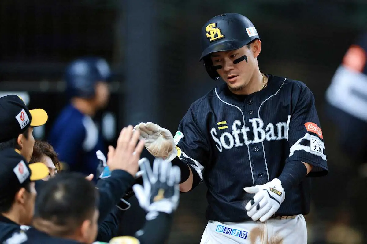 0―0の5回先頭で四球を選ぶと1死二塁から近藤の適時二塁打で先制のホームを踏む。1―1の7回1死でも再び四球で出塁し、一、三塁から中犠飛で決勝点となる得点を記録した。昨季は首位打者に輝いたが、四球は7と極端に少ない早打ちタイプ。ただ、今季は23試合目で早くも6個だ。小久保監督も「積極的なスタイルは変えずに(カウント)3―2だけ意識を変えようと伝えていた。1桁(四球)の首位打者は勲章じゃないよと話していた。選んでくれると上位につながる」と評価していた。