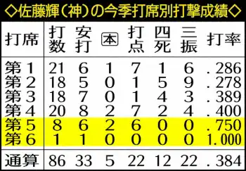 この日は4度出塁し出塁率・450は再びリーグトップに浮上。10度目の複数安打で打率も・384と4割復帰を射程圏にした。日曜日こそ、勝利を呼ぶ一打を佐藤輝が決める。