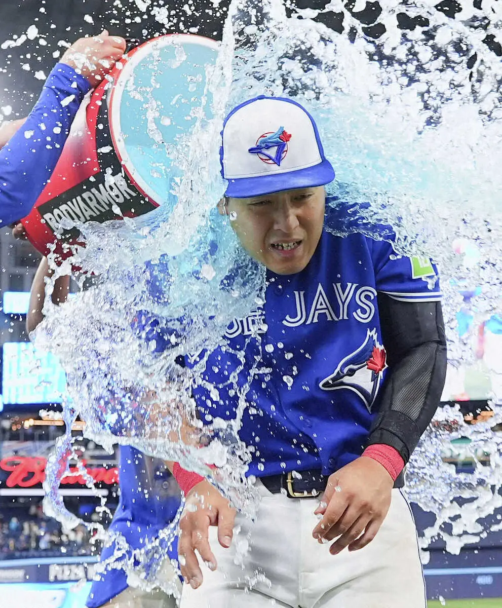 試合後に手荒い祝福を受ける、5号ソロを放ったブルージェイズ・岡本