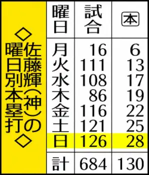 ○…佐藤輝は日曜日の試合で、曜日別最多の28本塁打。本塁打を記録した試合は通算22勝3敗と大きく勝ち越しており、22年6月12日のオリックス戦(京セラドーム)から17連勝中と「サンデー輝」の一発が勝利の吉兆となっている。