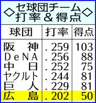 前日25日のドラフト1位・平川に続き、この日は佐々木…と、新世代の象徴というべき若鯉2人がスタメン落ちを余儀なくされる苦境。直近8試合連続で、消化した22試合のうち15試合が2得点以下という惨状では、浮上はおぼつかない。零敗4度は、リーグワースト。選手個々が自己責任で状態を上げるしかない。 (江尾 卓也)