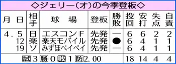 過去3試合はビジターでの登板。勝てば96年のヒルマン(ロッテ)の2メートル8を抜く史上最長身勝利となる。26日の日本ハム戦ではシーモアの4番初本塁打も生まれた。ジェリーが大きな右手で白星をもぎ取れば、さらなる勢いを呼ぶ勝利になる。 (石塚 徹)