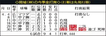 阪神・ドラフト3位ルーキーの岡城が、止まらない。「2番・左翼」で2試合連続スタメン出場。第1打席からの3打席連続安打で、一気にプロ初の猛打賞をマークした。