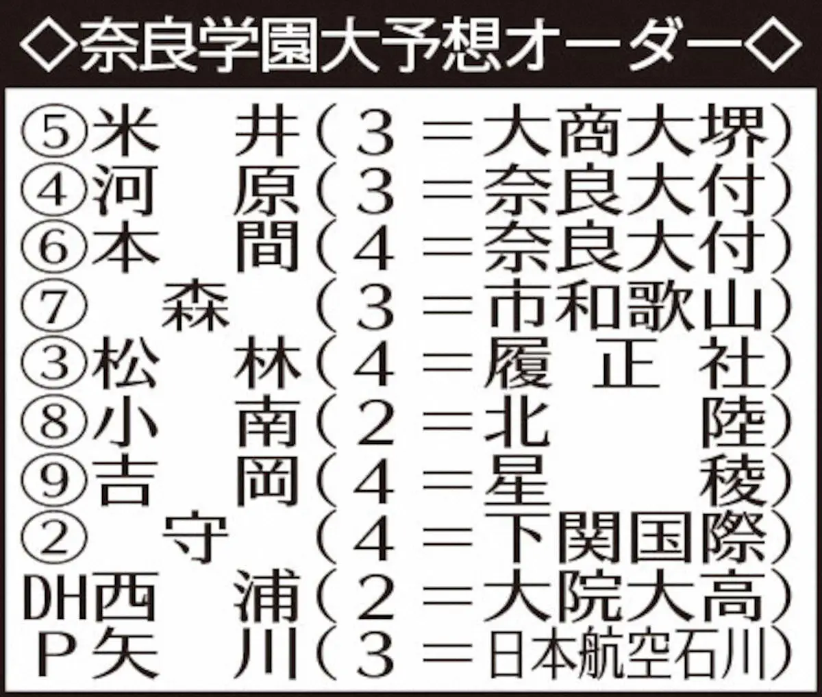 奈良学園大の(右から)河原、森、米井の3年生トリオ Photo by スポニチ 【近畿学生野球 8月30日開幕】奈良学園大 打の3年生トリオが3連覇へ導く ギャラリーで見る この記事のフォト 関西大学野球リーグの写真一覧 もっと見る