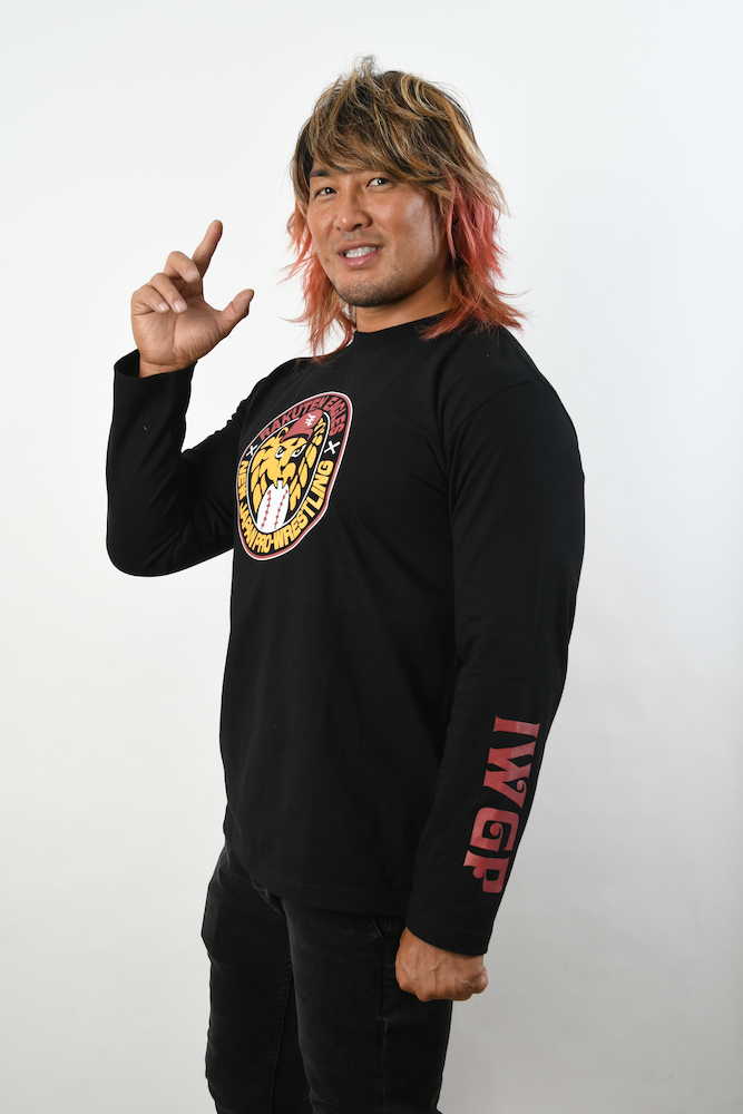 販売が決定したTシャツを着てポーズを決める新日本プロレスの棚橋(C)NJPW
