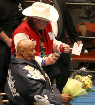 ブッチャーは車いすに乗ってリングに登場。ドリー・ファンク・ジュニア氏やスタン・ハンセン氏、マスカラス兄弟らから花束を贈呈された。