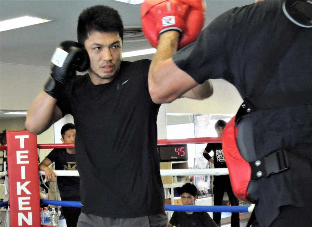 カルロス・トレーナーを相手にミット打ちを行う村田諒太