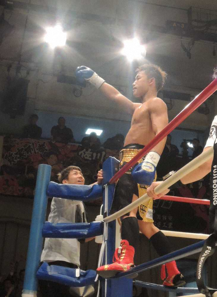 花咲徳栄高時代に高校総体ライト級で準優勝した期待の新鋭。4月のプロデビュー戦で勝利後、年内のユース王座獲得を掲げた。デビューから3連勝で“公約”を果たした18歳は「目標を達成できたのは良かった。でも、ジャブが想定通り当たっていたのに、プレスをかけられて臆病になったところもあった」と反省を口にした。それでもアマチュア時代に頂点に立つ経験がなかっただけに獲得したベルトを手に「ユースですけど、1番になれたのはうれしいです」と笑顔を見せた。